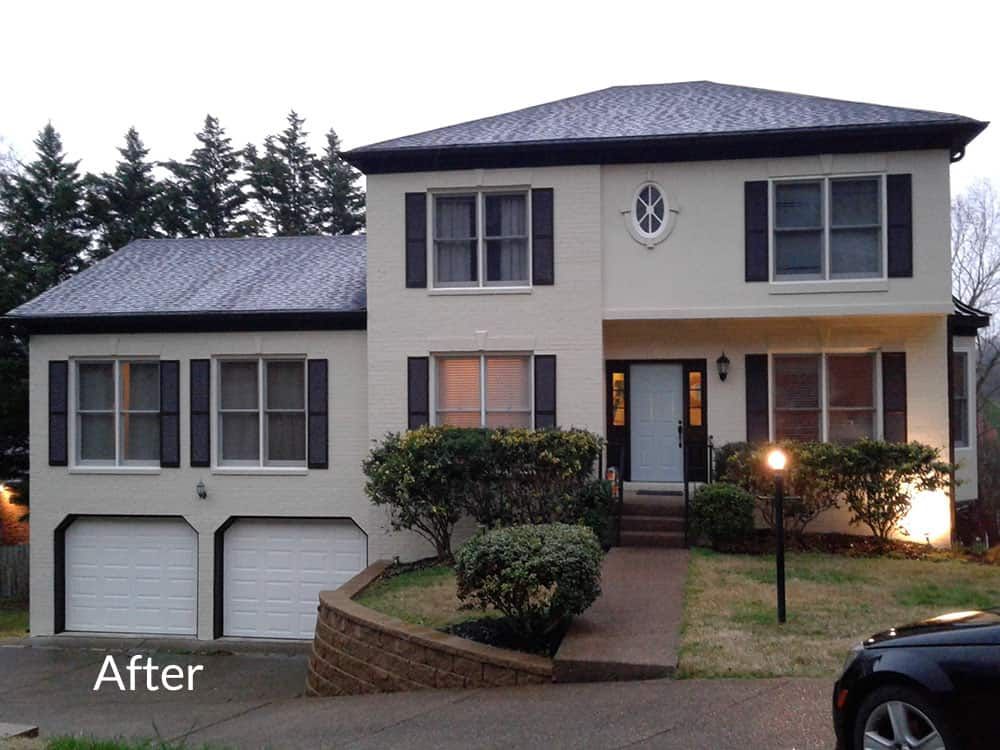 This repeat customer met with our in home color consultant. We love how much the white brightened up the house. The timeless satin black on the trim, shutters and doors looks so rich. We matched their black roof shingle to make everything really pop!